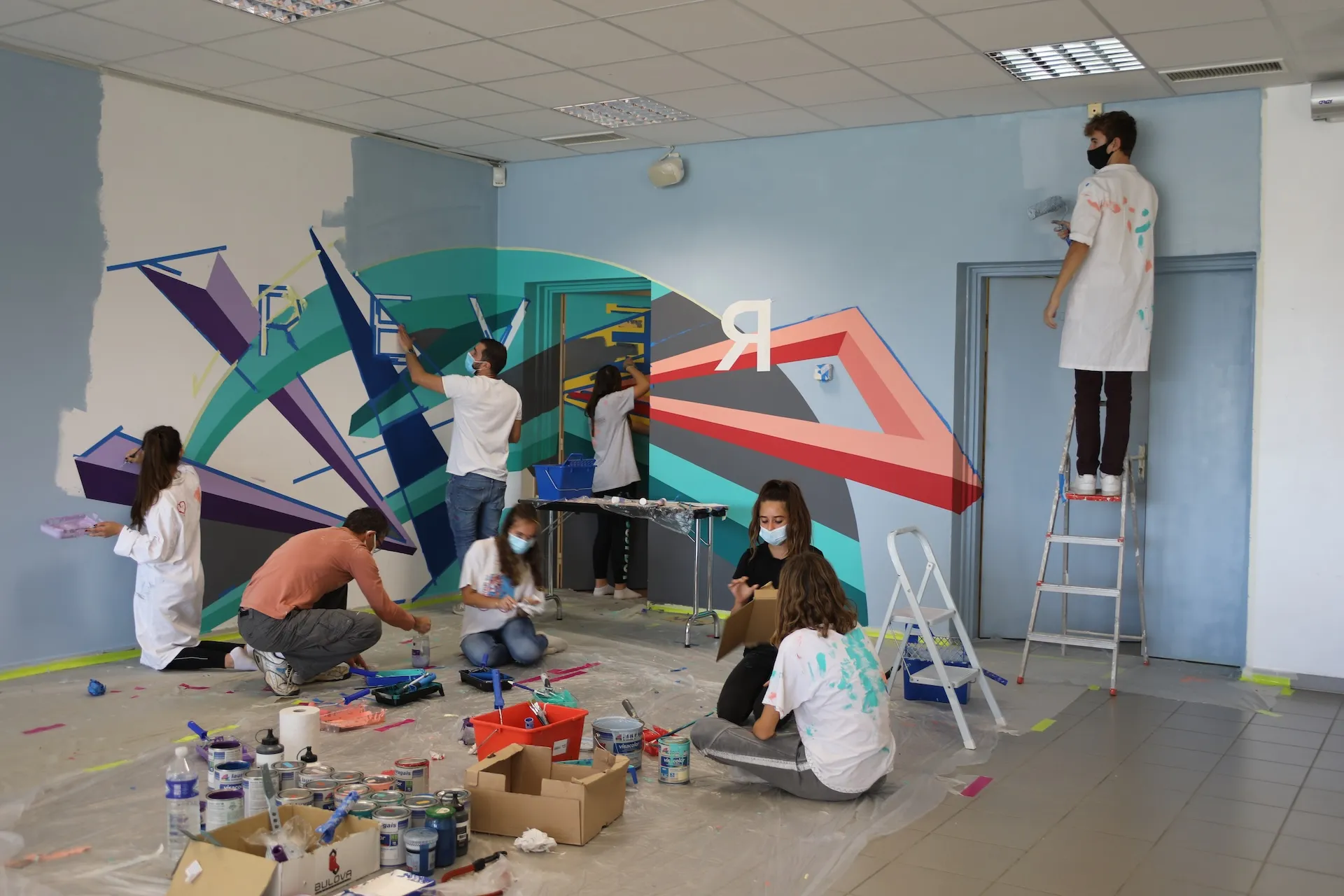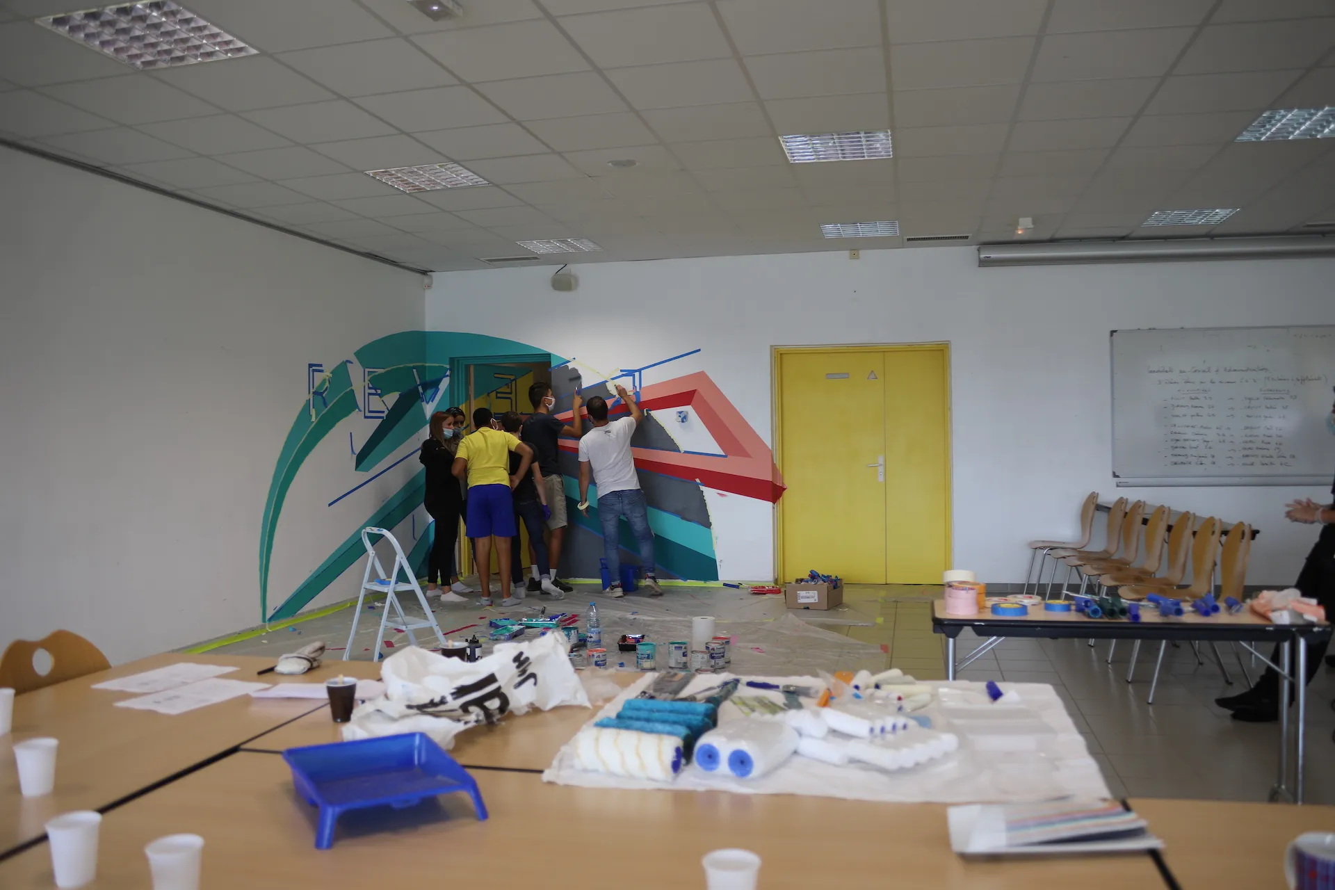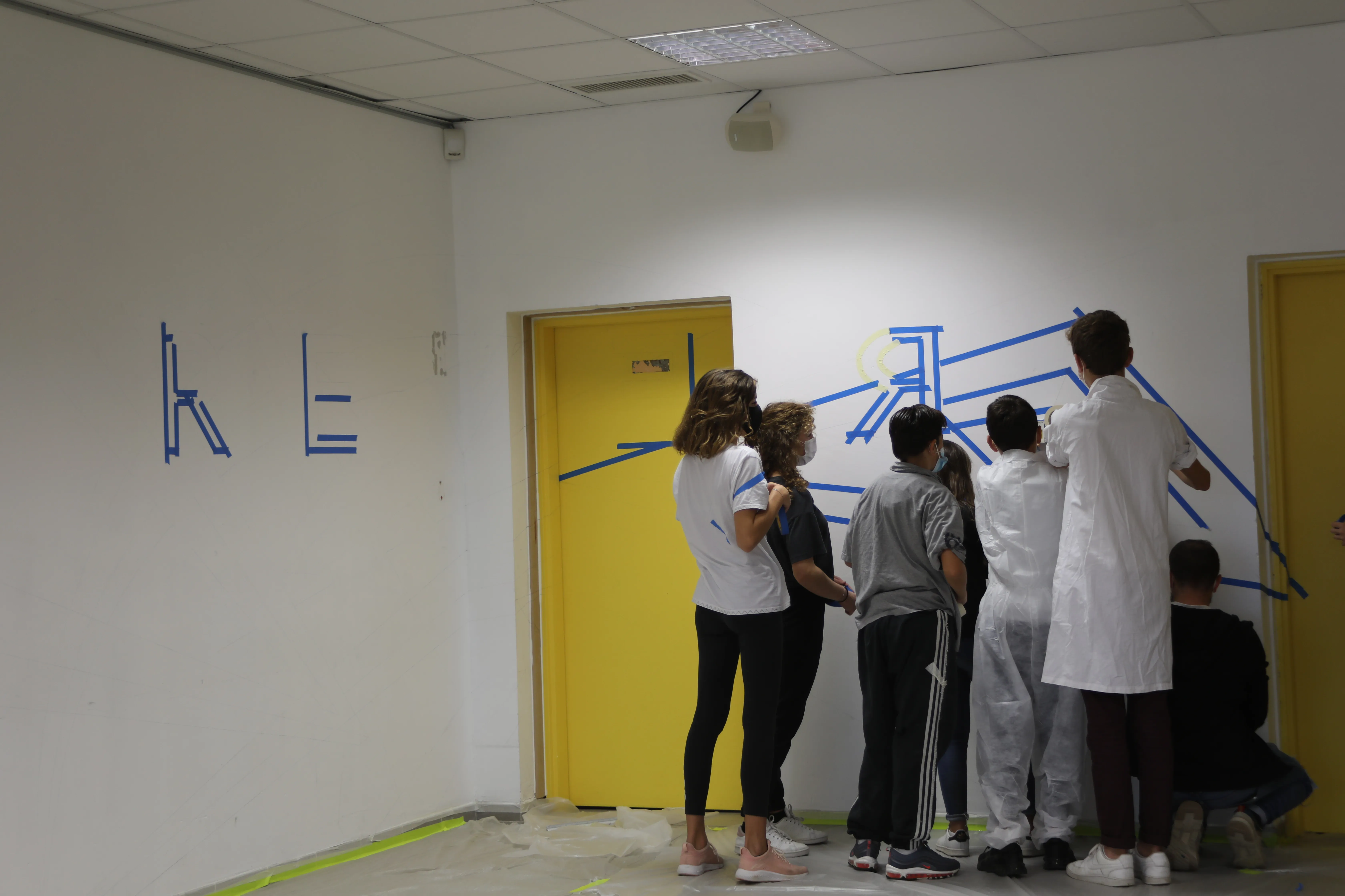 L'artiste intervient au collège Pierre Mendes-France et réalise une oeuvre murale avec la participation des élèves. Ensemble ils combinent les formes géométriques colorées dans une composition signature de l'artiste, avec le mot "REVER" écrit comme un palindrome.