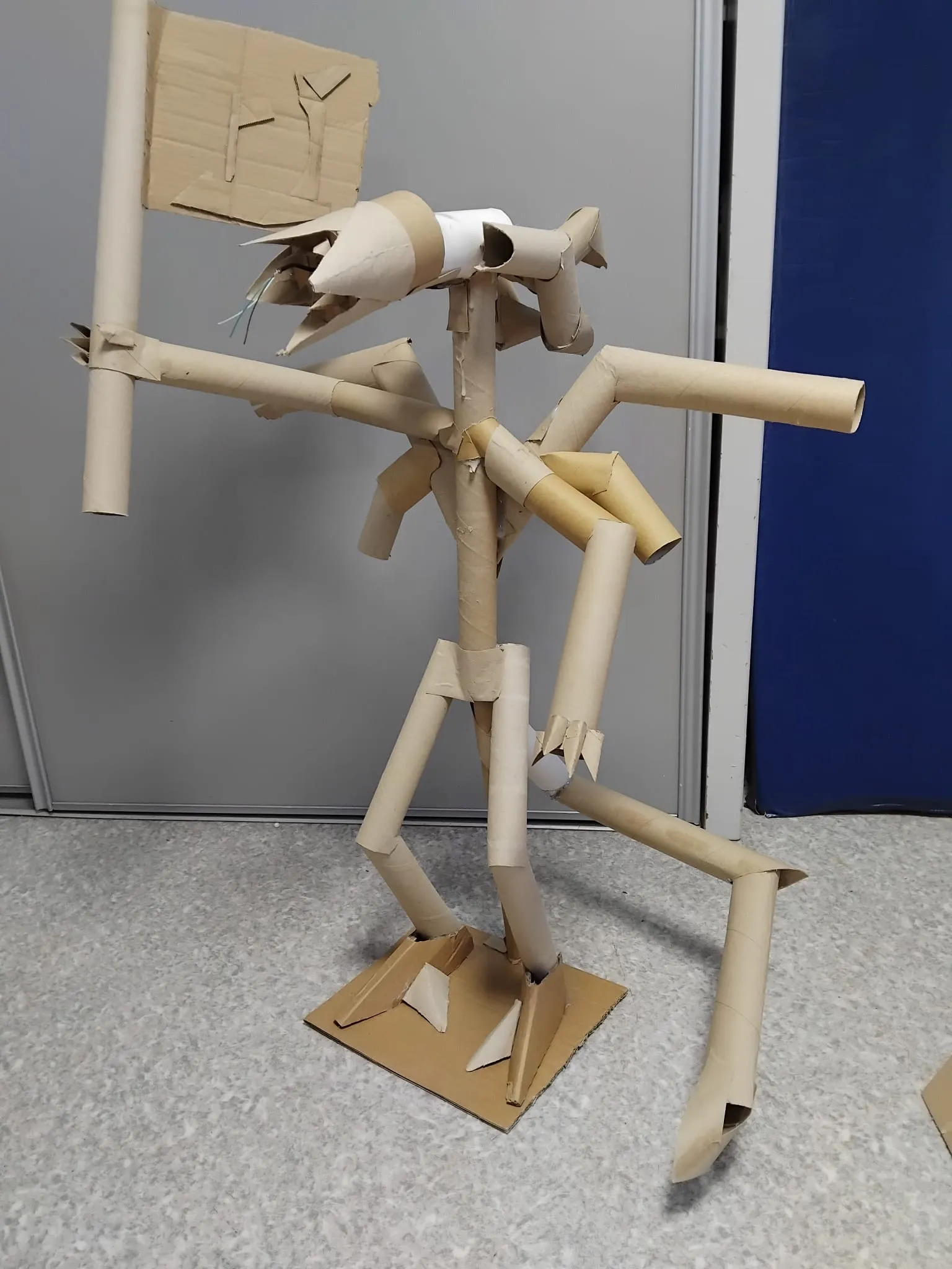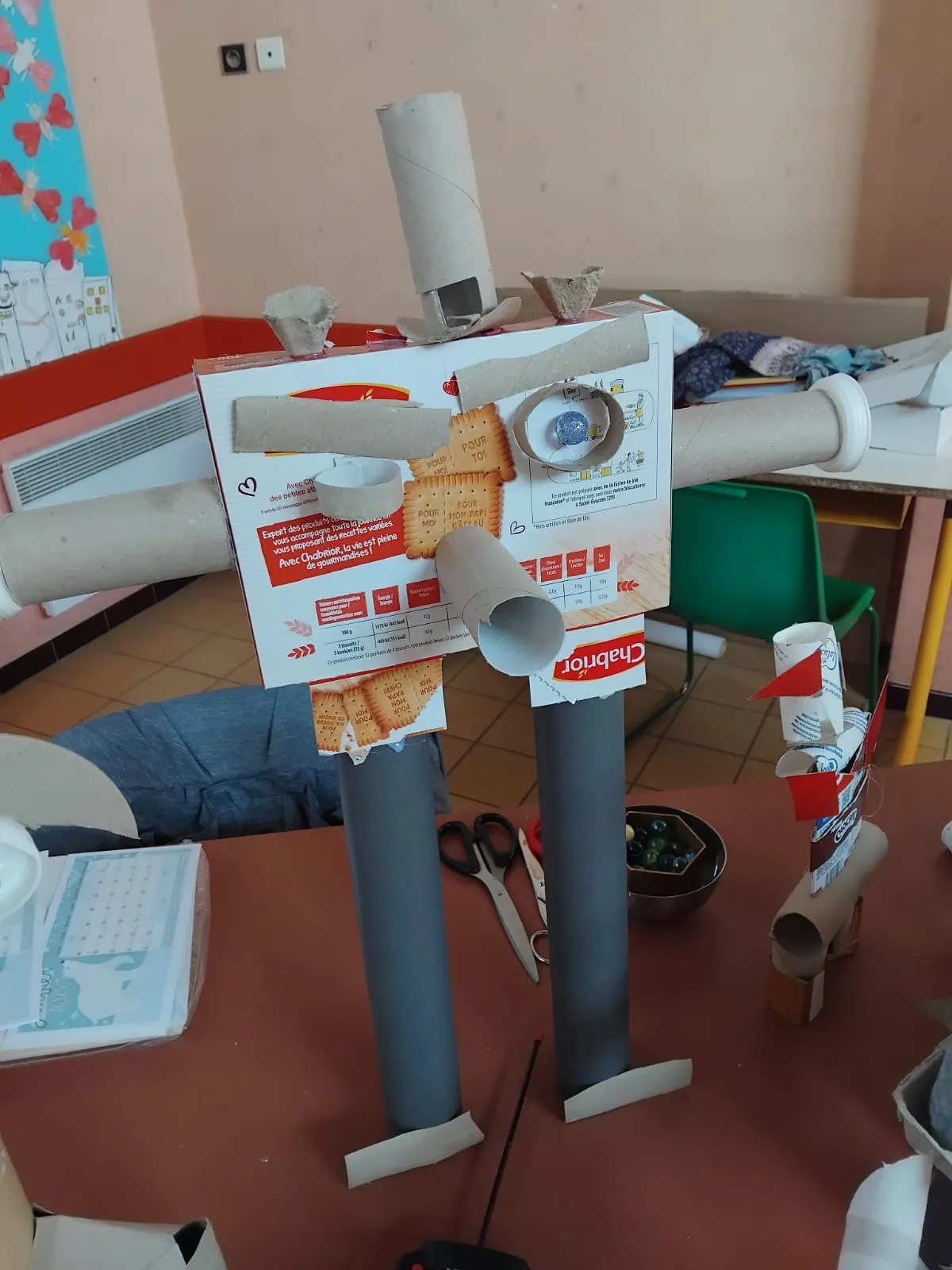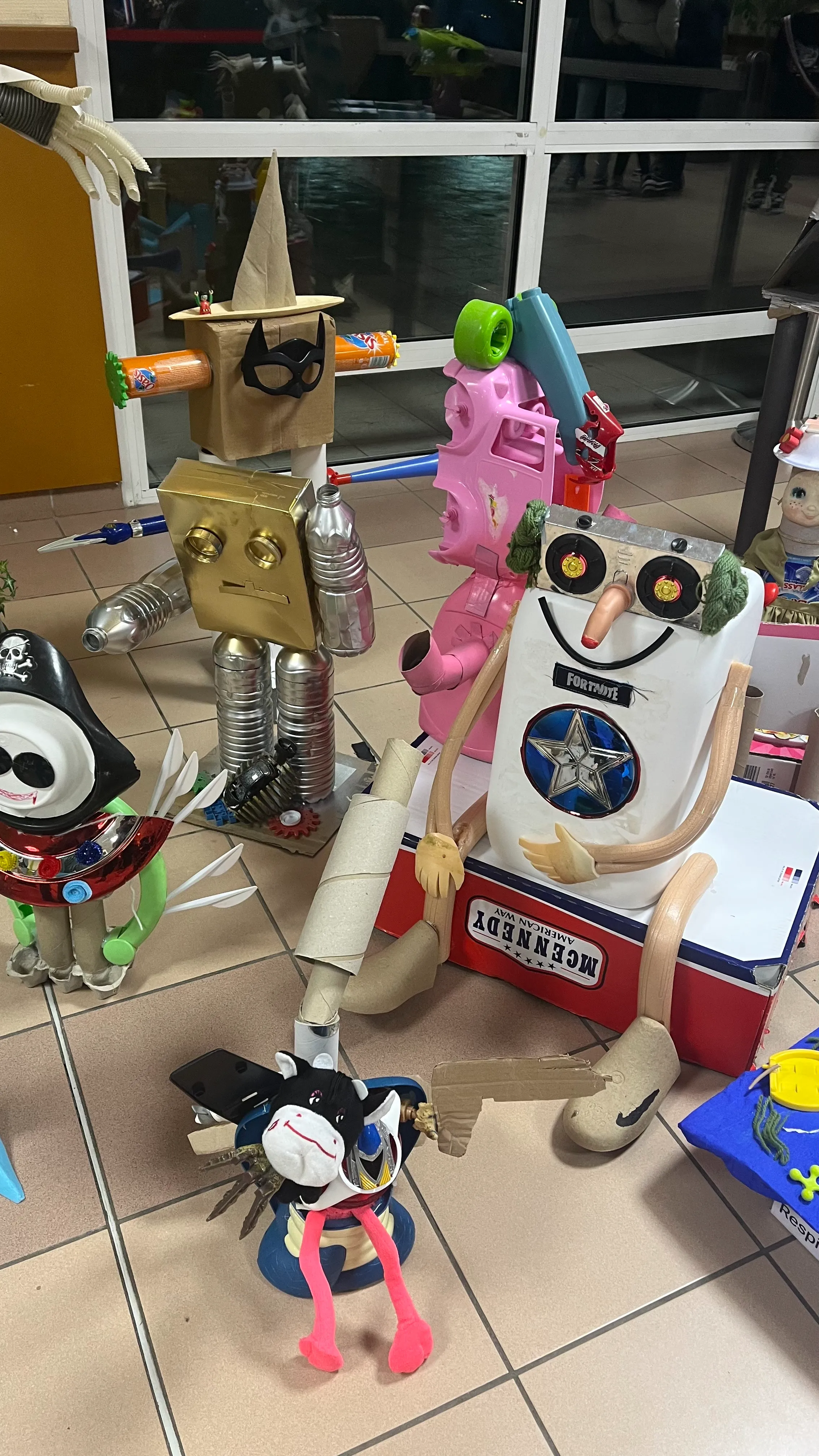 Tout au long de l'automne 2025, Yann Birgy a mené plusieurs ateliers participatifs avec différents publics de la ville : les élèves des classes de CM2 des écoles, les enfants de l'ALSH ainsi que les ados du Secteur Jeunes. Tous ont eu l'occasion de créer un personnage de type robot avec des déchets comme des rouleaux de sopalin, des bidons de lessive, etc.